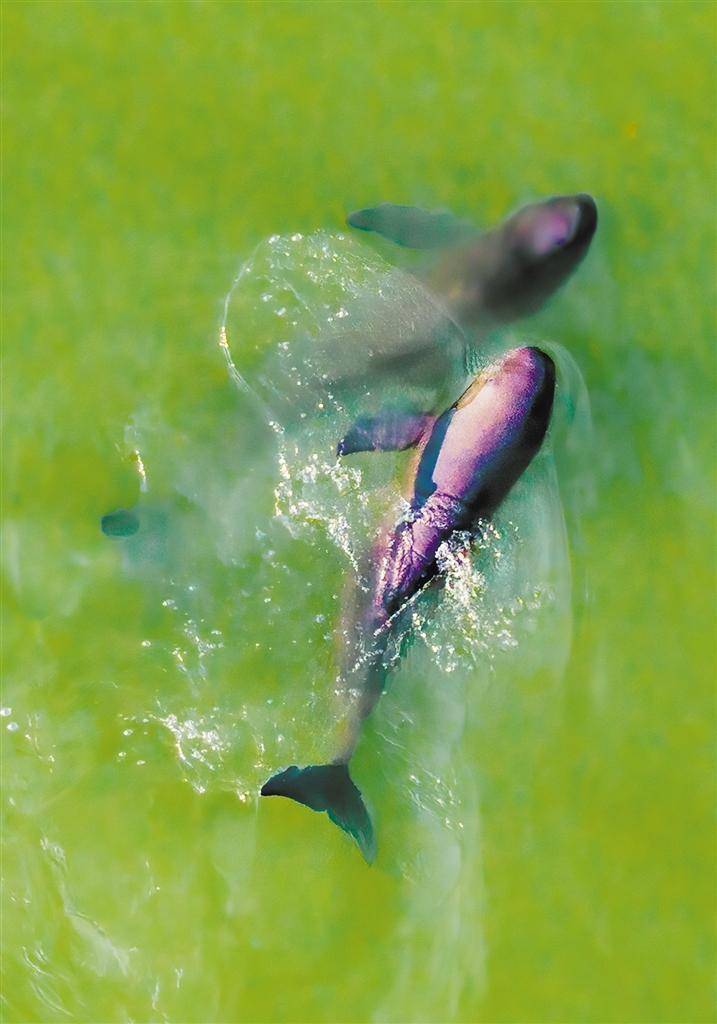 2025年9月17日,在长江与鄱阳湖交汇处的九江湖口水域,两头江豚在水中嬉戏。夏忠亮摄(中经视觉)