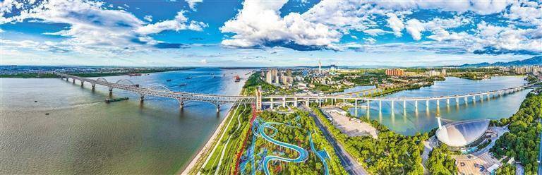 2025年7月20日,俯瞰长江国家文化公园九江城区段,蜿蜒的游步道与周边建筑、绿树、蓝天、碧水相映成景。李学华摄(中经视觉)