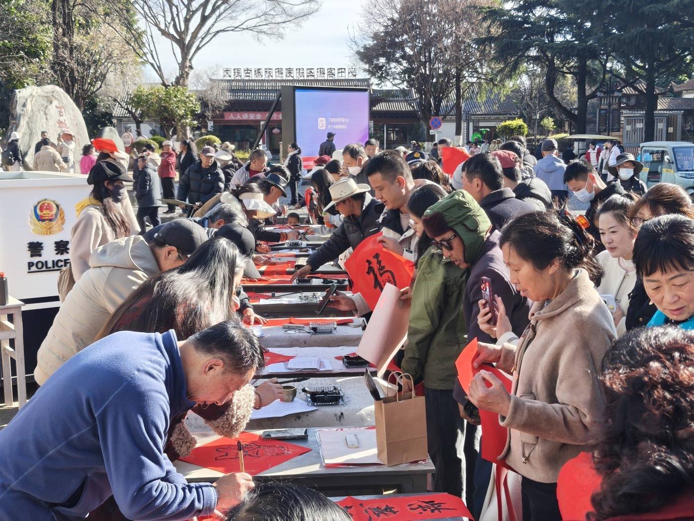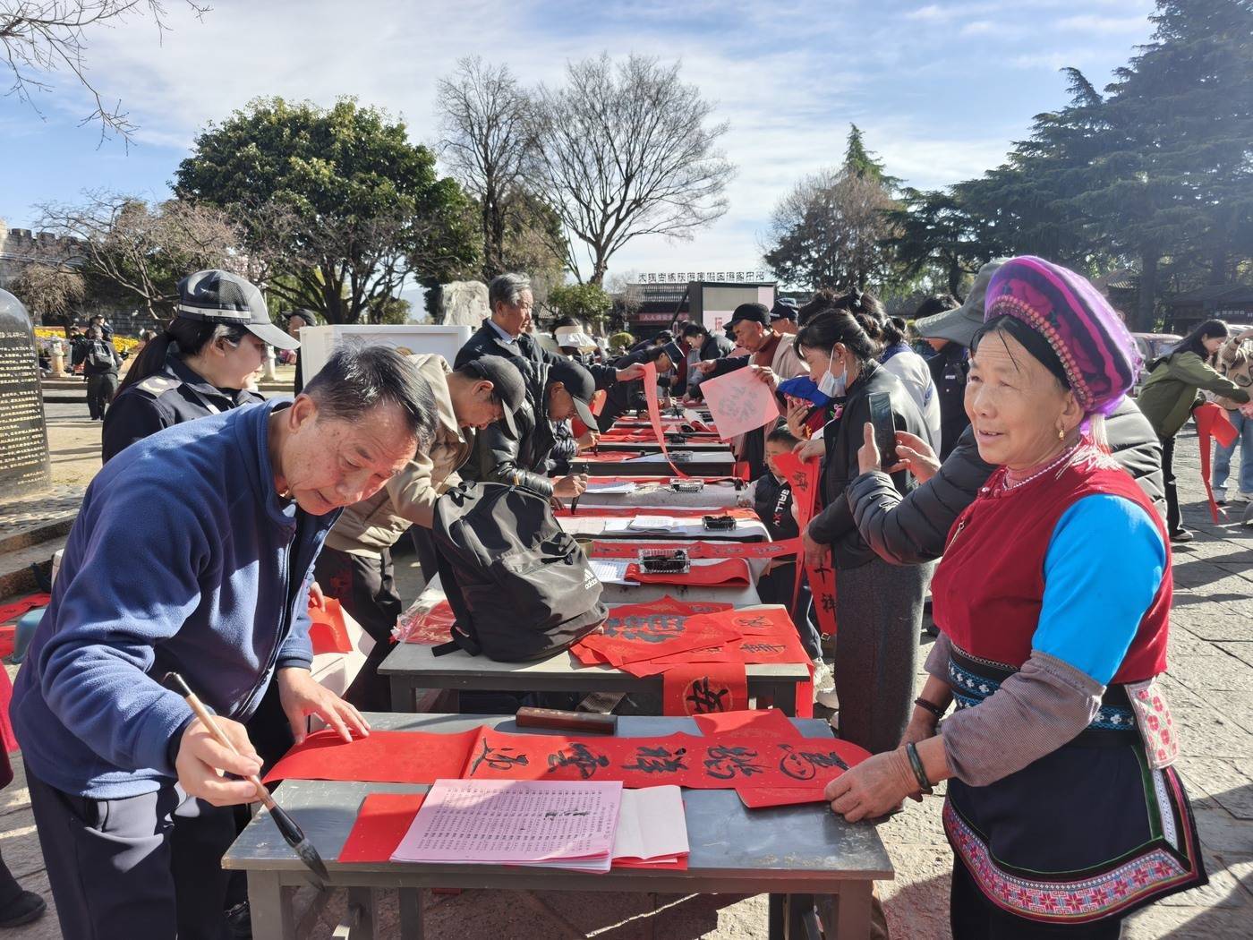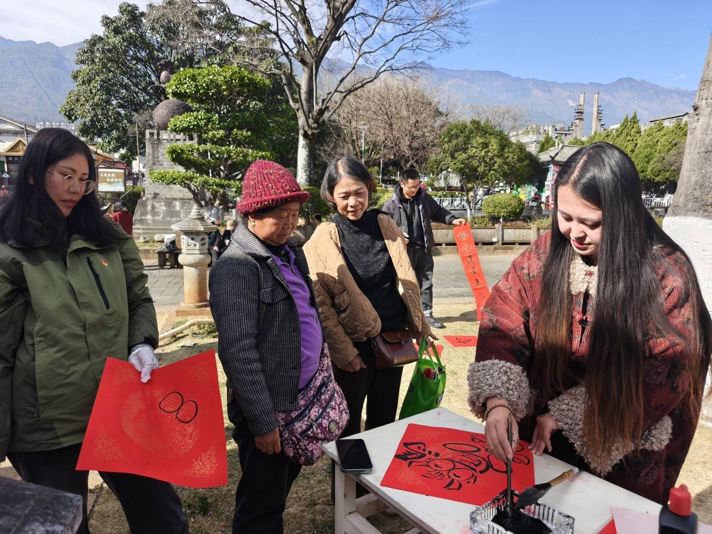 2月4日上午,大理古城华侨城运营管理有限公司携手大理州老干部诗书画协会,在大理古城南门广场开展“马年新春送福”书法活动,16名书法家挥毫泼墨,为市民和游客送上新春祝福。