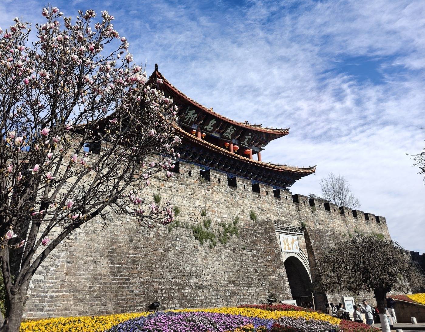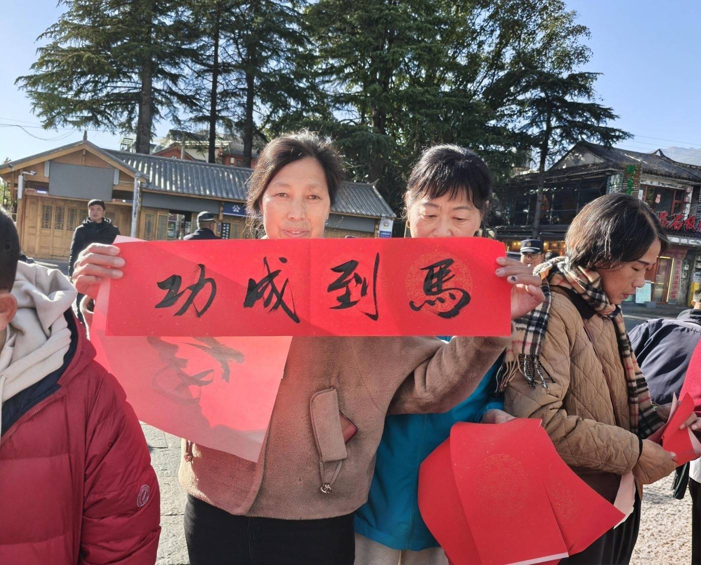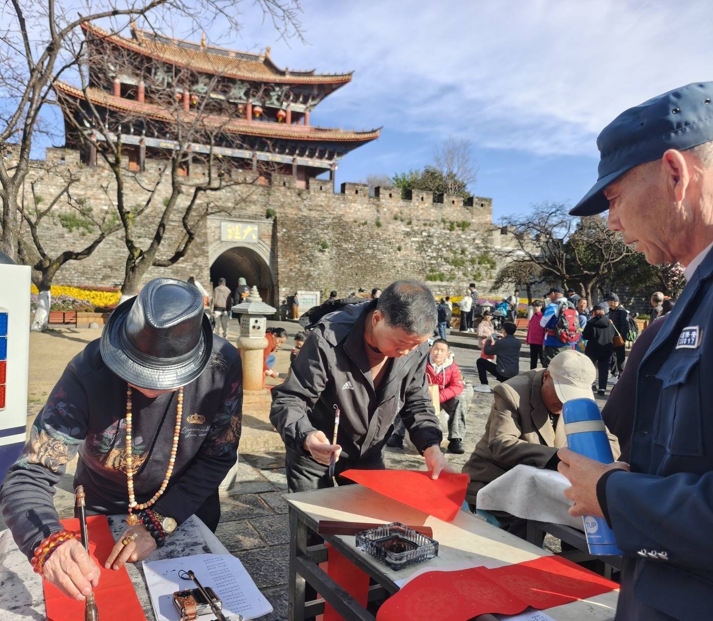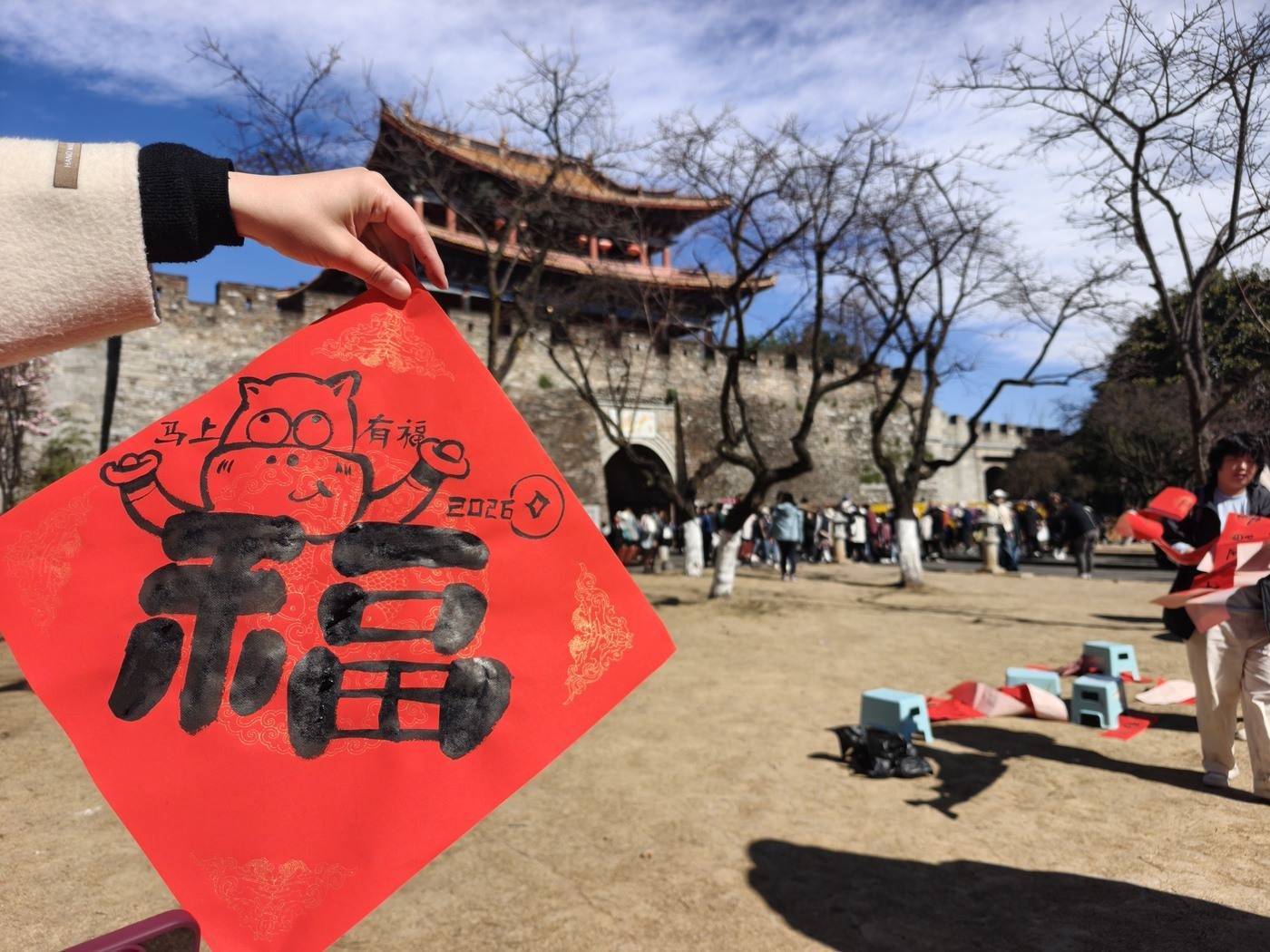 大理古城南门城楼是古城地标建筑之一,城楼前游人如织,一幅幅手写春联将大理的祝福送到游客手中,让更多人感受到文献名邦的文脉底蕴。不一会儿,场地上就铺满了写好的春联,空气中纸墨飘香,阳光下,等待墨迹干透的每个人都喜气洋洋。大理州老干部诗书画家协会秘书长赵傣表示:“我们很高兴能用笔墨把祝福传递给大家,写福字、送春联,既是为市民游客送上新春祝福,更是希望让传统文化在景区‘活’起来。”