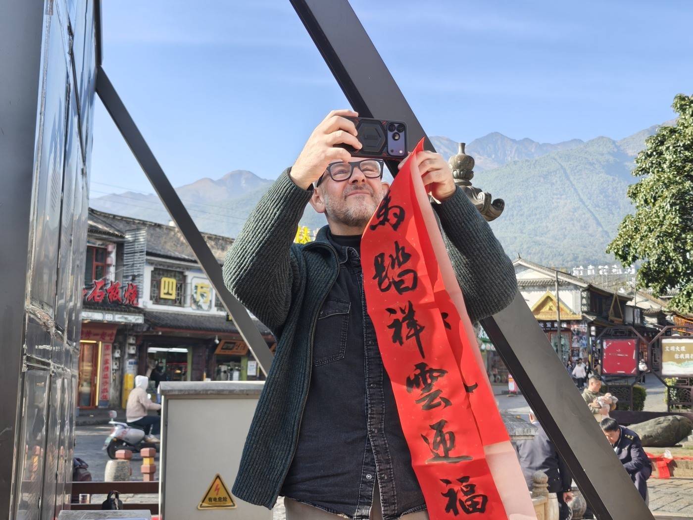书法与景区的联动,让中外游客在笔墨清香中体验中华年俗。西班牙游客恩里克·兰兹举着手机拍摄下热闹的场景,他表示:“这是我第一次来大理,在短时间里就爱上了大理的建筑、美食和人,被这里无处不在的美丽所震撼。我非常喜欢中国书法,我要把这份来自大理的珍贵礼物带回家。”